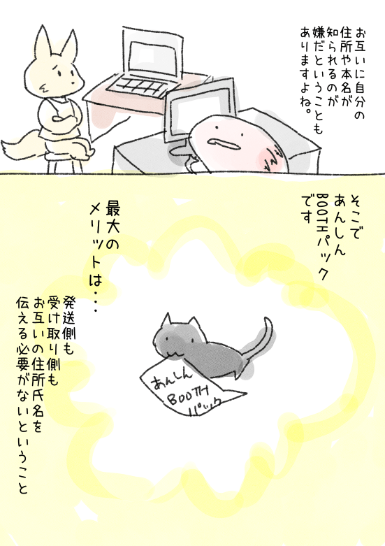 なにかしらの創作活動をしていると、自宅から通販処理をする場合も出てくると思います。わたしはとにかく面倒なので、絶対自宅通販したくないマンだったのですが・・・BOOTHのサービスのひとつ、「あんしんBOOTHパック」のおかげでかなり楽になりました!決済手段も色々あるかわりに手数料が若干かかりますが、わたしのように「とにかく住所とかをいっぱい書くのがしんどい」という人にはオススメのサービスです!共有:Facebook で共有するにはクリックしてください (新しいウィンドウで開きます)Facebookクリックして X で共有 (新しいウィンドウで開きます)Xクリックして Threads で共有 (新しいウィンドウで開きます)Threadsクリックして Bluesky で共有 (新しいウィンドウで開きます)Blueskyクリックして Mastodon で共有 (新しいウィンドウで開きます)Mastodonクリックして友達にメールでリンクを送信 (新しいウィンドウで開きます)メールアドレス